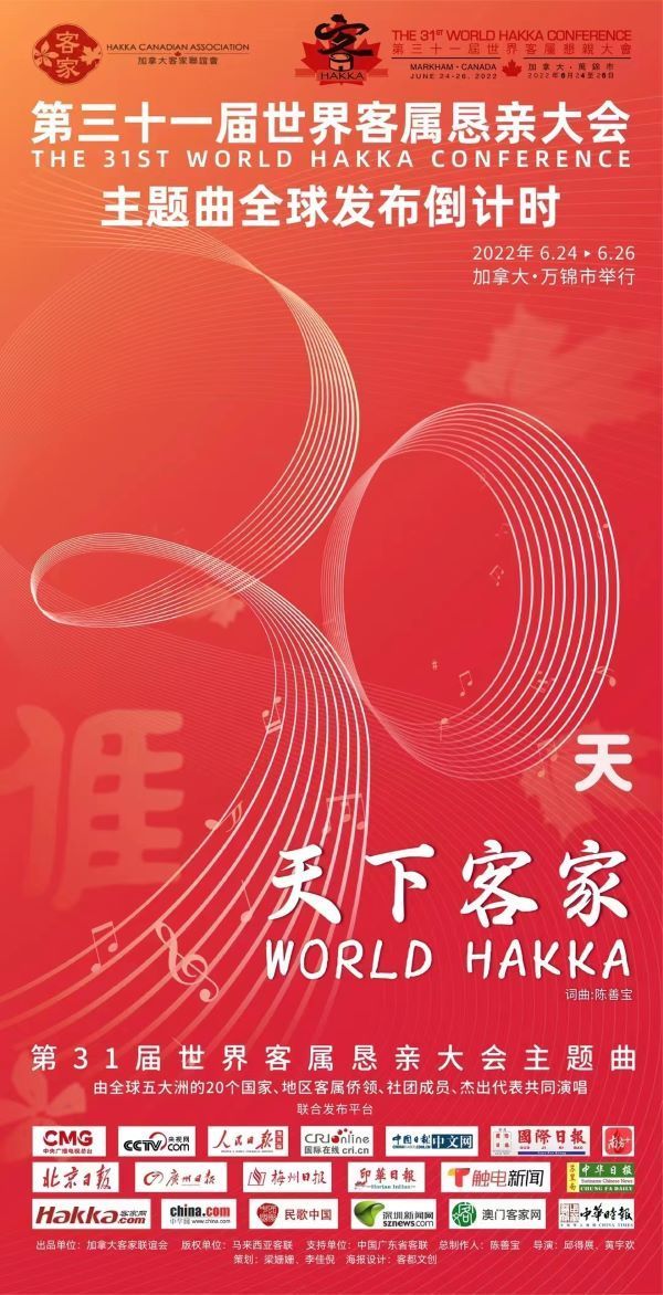 据了解,第31届世客会将于2022年6月24日在加拿大安大略省万锦市(Markham)开幕,主题曲《天下客家》也将于当天全球首发。《天下客家》是由第30届世客会主题曲《Hakka客家》改编而成,原出品方、版权方是马来西亚客家公会联合会。因世界各国、各地区客属侨领对第30届世客会主题曲印象深刻、好评如潮,大家一致倡议第31届继续沿用该主题曲,并指定由《天下客家》原创者陈善宝继续担任总制作人。