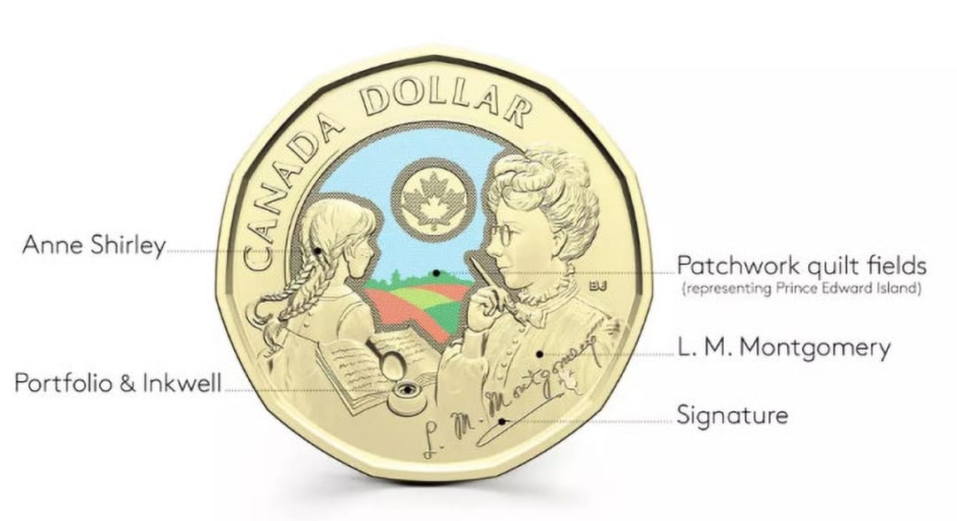 硬币上包括了Montgomery的肖像和她的签名,以及代表PEI的拼布被图案。在左侧,可以看到《绿山墙的安妮》女主人公Anne Shirley的标志性侧脸,她的辫子和PEI的风景背景清晰可见。