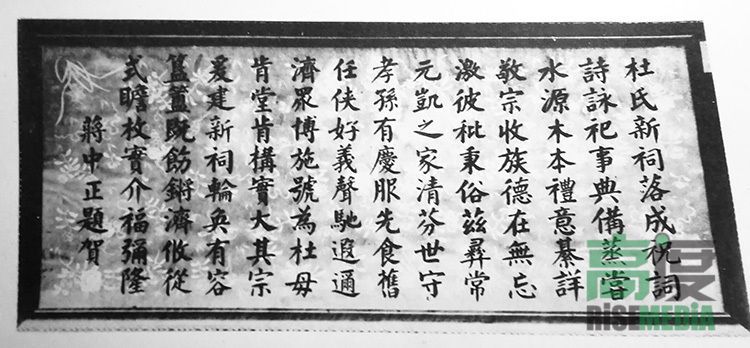 杜家祠堂落成的時候,很多名人政要送了匾額。蔣介石送的是“孝思不匱”,于右任送了“源遠流長”的牌匾,有一塊匾是日本海軍部次長永野修身送的。為什么要特別提到提到永野修身這個事情呢?是因為那個時候,日本人想討好我父親、拉攏我父親,那塊匾我后來看見過。當時送的那些匾,現在都沒有了。祠堂落成的時候,請了南方北方京劇界的所有名角兒來唱義務戲,就是現在說的義演,唱戲的一些收入用于賑災。當時,除了余叔巖生病以外,所有的南北名角兒都來了。印了很多紀念冊和戲單,來的人人手一份,還有紀念品。軍政要員送的匾額、頌詞和戲單都寫在了當時的紀念冊子里了,如果能夠找到當時的冊子,就可以找到匾的文字和送匾的人。現在很難找到了,或許一些老人手里有可能還有這些東西。那次的活動是在特殊時代、特殊社會背景下形成的,以后也不會再有了。