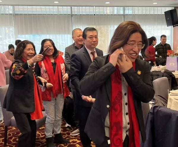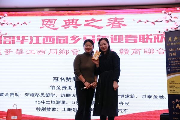 常言道:远亲不如近邻。温哥华江西同乡会自成立以来,也一直得到大温地区许多社区团体,社区朋友的关爱。比如:全加客属联谊会,加拿大华人社团联席会,中华会馆,加拿大华人联合总会,安徽同乡联谊总会,河南同乡联谊总会,广西总商会,福建龙岩同乡联谊总会,加拿大海陆空退伍军人协会等...加拿大华人社团联席会执行副主席洪绮璟在江西上饶长大,对江西有着深厚感情。她还即兴且深情演唱一曲《请茶歌》,同志哥,请喝一杯茶呀,请喝一杯茶呀...