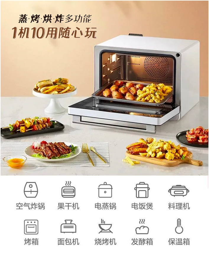 方太蒸烤烘炸四合一台式一体机一经推出就火遍全网,被用户们亲切的成为小方/魔盒。它体积虽小却功能强大, 10大烹饪手法和40个预设菜单能通过多种料理方式让各种食材呈现出缤纷美味。从百变烘烤到健康蒸菜,跨越中西,突破传统,融合万千。只有想不到,没有做不到!