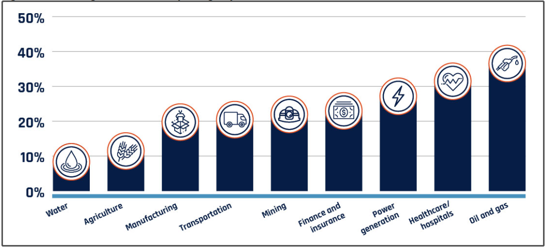 据加拿大统计局2019年的调查数据显示,约有25%的被分类为石油和天然气的加拿大组织报告了网络袭击事件,成为首当其冲受到网络攻击影响的加拿大重要基础设施部门。2019年,加拿大政府报告的黑客袭击事件显示了重要基础设施部门受到网络攻击所占的百分比。其中,能源、医疗卫生和电力等部门最易受到黑客攻击。
