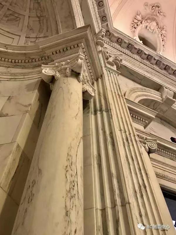 走近图书馆,在大门前就可以看到十几个雄伟的圆柱和一段长长的台阶,十分震撼!这不仅展现了图书馆的权威,同时白色大理石的圆柱与红砖主建筑色彩上的呼应,也使得图书馆更典雅、独特。