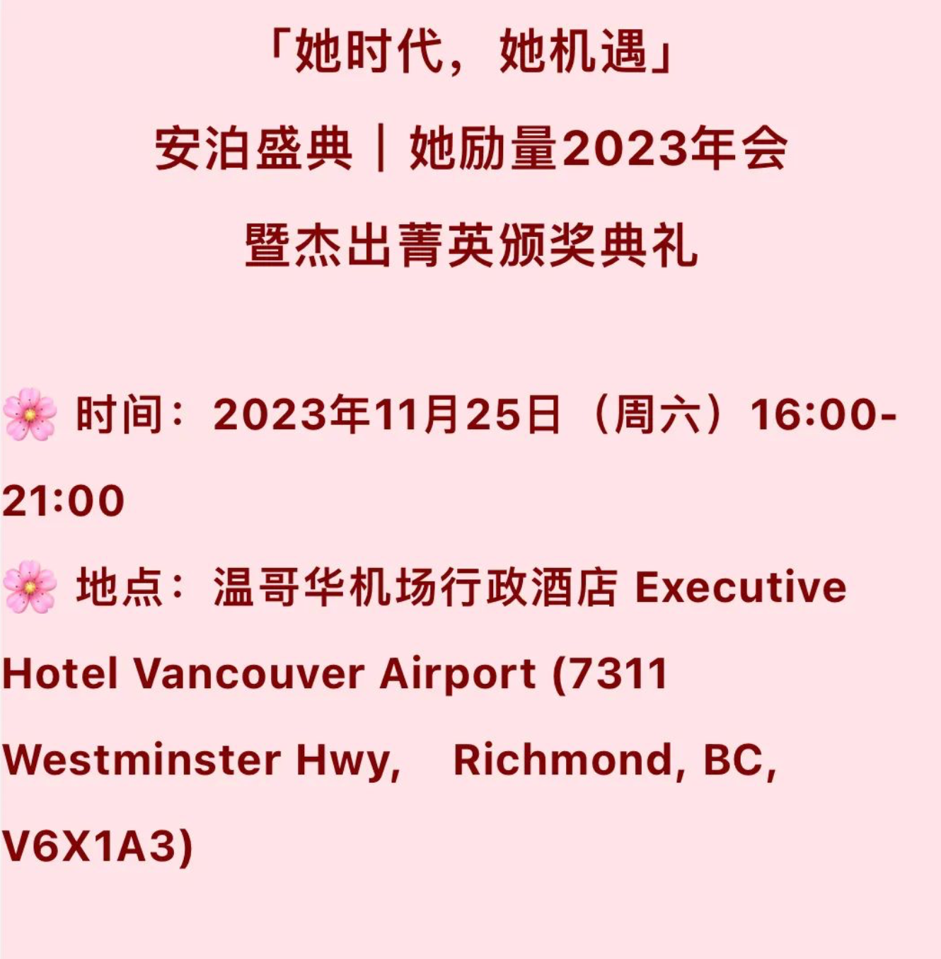 有意参加本次晚宴的学者、企业家、政治家、职场精英、媒体等关注女性力量的女性及友人,求职者、创业者与渴望学习与成长的女性,有潜力的新锐青年和优秀母亲们请在10月31日前通过电子邮件,或电话方式联系我们进行报名。同时请提供您的姓名、联系方式和公司名称等相关信息,我们将为与会者提供更多详细的活动安排。电话:236-967-1080邮箱:info@herpowerclub.com地址:Unit 415-5900 NO.3 Rd. Richmond, V6X 3P7