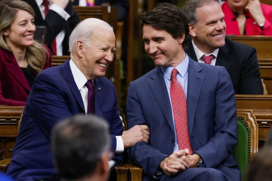 美国总统拜登于 2023 年 3 月 24 日在加拿大安省渥太华加拿大下议院与加拿大总理特鲁多互动。(图自 CNBC)