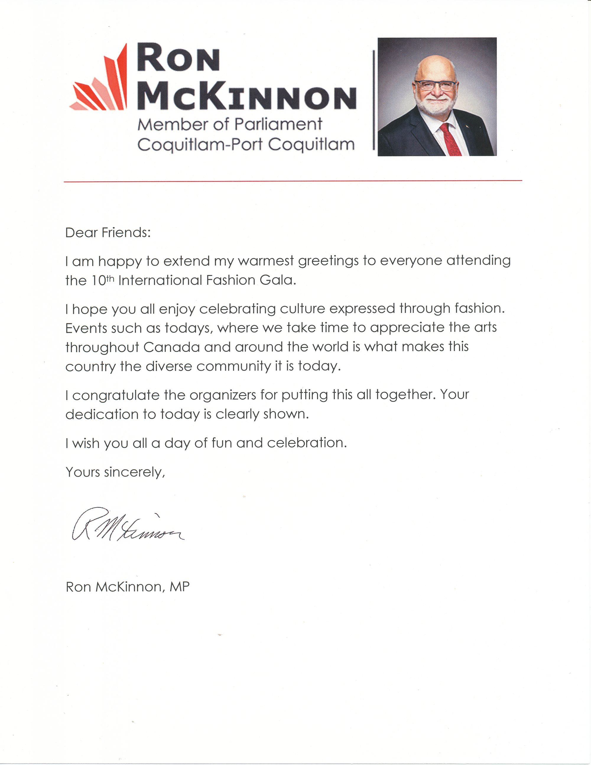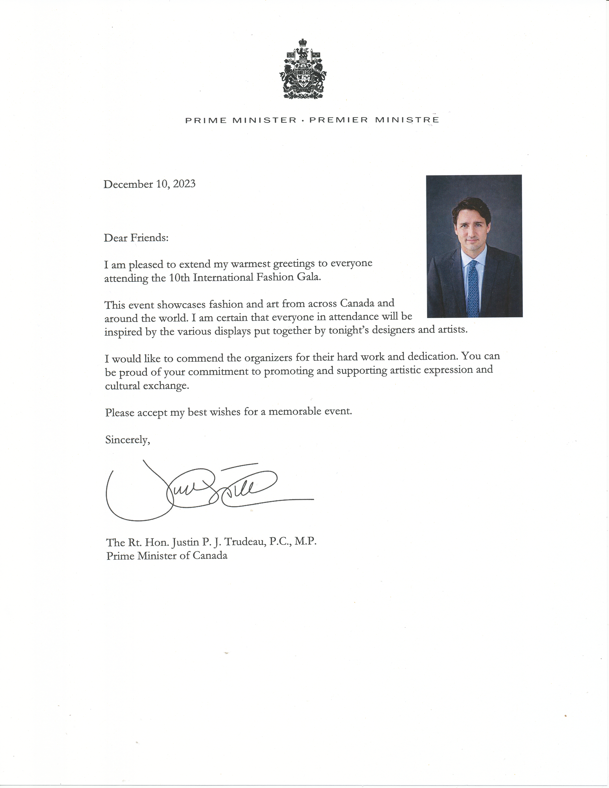 加拿大总理及国会议员为国际时尚盛会发来的贺信