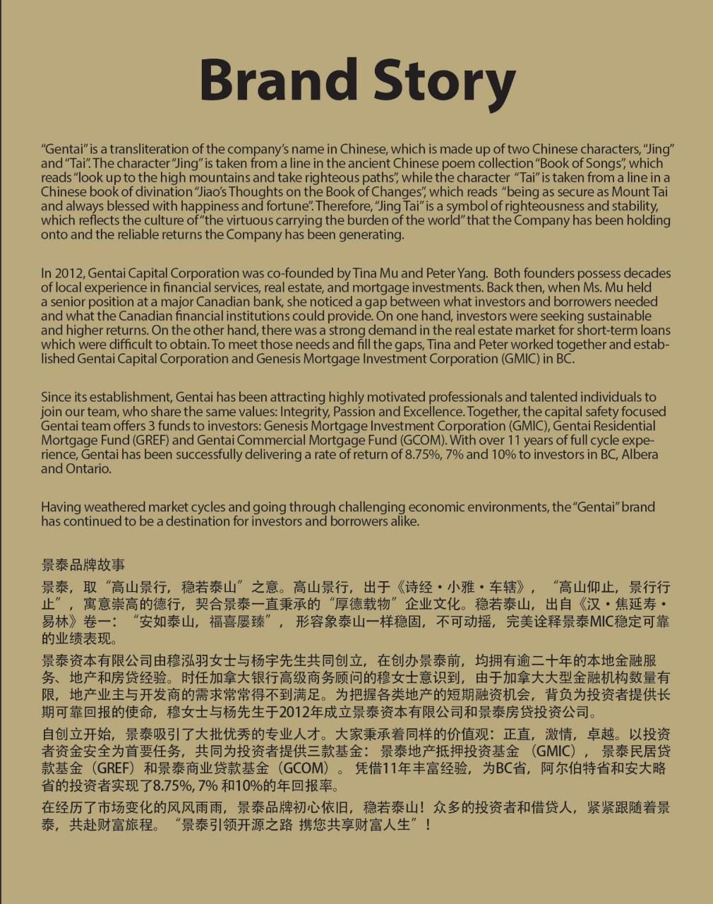 Rayson:我在景泰工作已经三年,即将迎来第四个工作年头。最初我从事与房地产相关的工作,从香港投资银行业务,担任投资分析师负责帮助企业上市,到温哥华的汇丰银行担任客户经理后并加入了景泰。我认为景泰在投资房地产抵押贷款方面做得非常出色,采用独特的投资定位和风险管理。在景泰,我从客户中听到最多词就是 “稳定和安全”,这也是我认为每位投资者都需要了解的理念。
