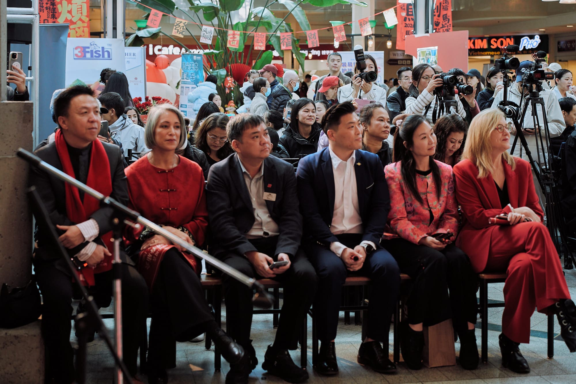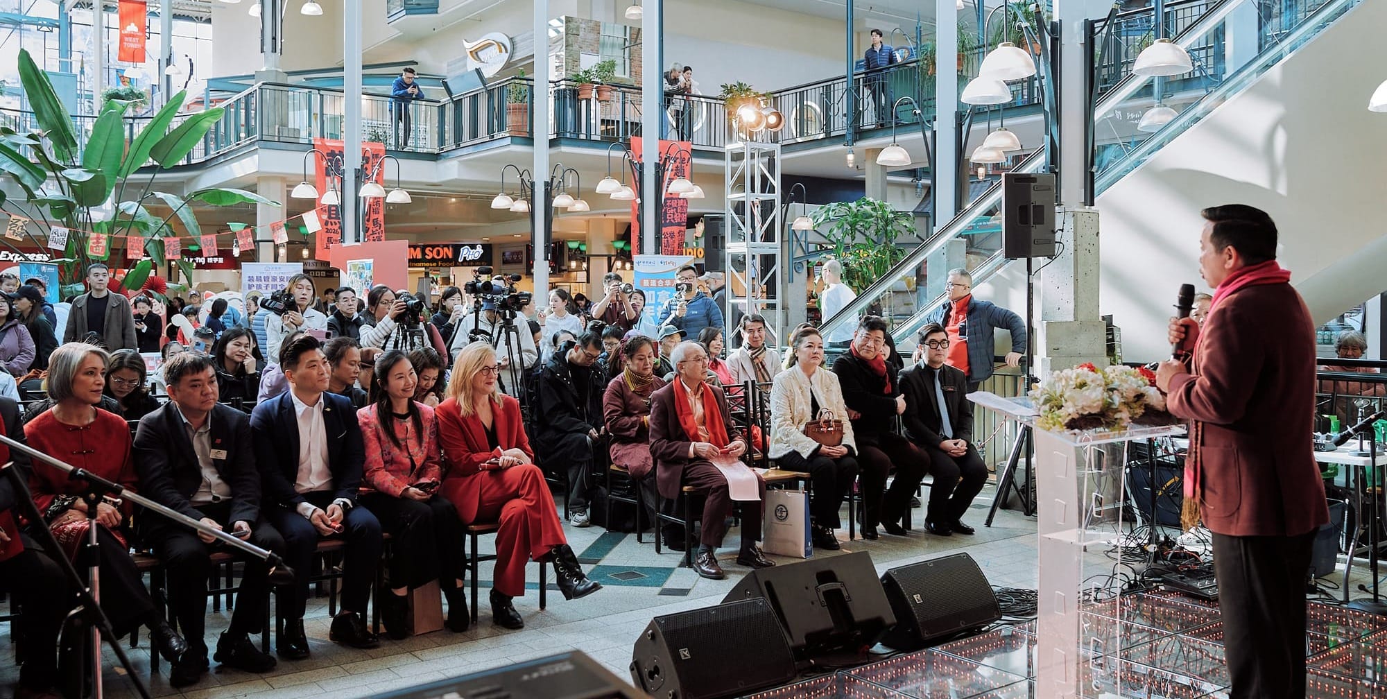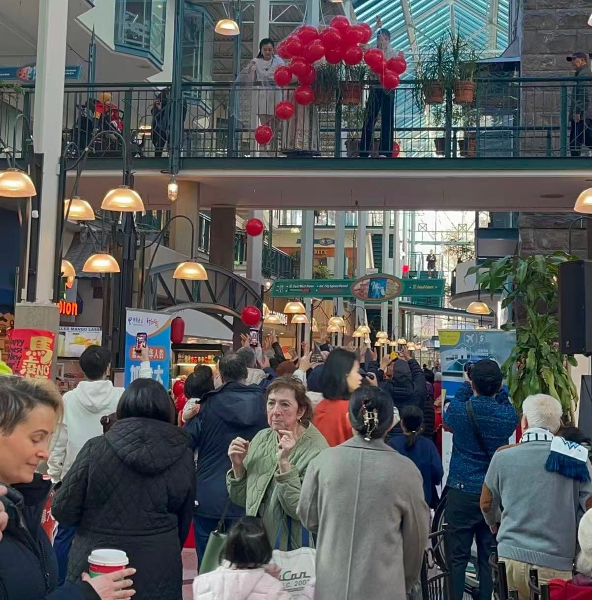 上午的剪彩仪式群贤毕至。卑诗省財政廳長Brenda Bailey、卑诗省旅遊、藝術、文化及體育廳长康安禮、卑诗省议员周炯华、本拿比南選區省議員Paul Choi、溫哥華市議員周楠、本拿比市議員王白進、列治文市議員盧仙泳等三级政府代表,与活动赞助主办方: 华联会执行会长、富渔国际首席执行官 - 傅宾清先生、华联会执行会长、FX168财经集团总裁 - 江泰先生、华联会名誉主席 - 宋九宏先生,华联会执行会长刘娜、曾彩云,购物中心常务总监 - Denise She,加拿大温哥华中华会馆理事长 - 钱华、加拿大国际贸促会长郑小玲、 温哥华禺山总公所理事长 - 徐艺豪、加拿大印太基金会主席 - Bhhaskar De、星瞳活动策劃总裁 - Kennith Chui共同执剪,在倒计时声中为庙会正式启幕。