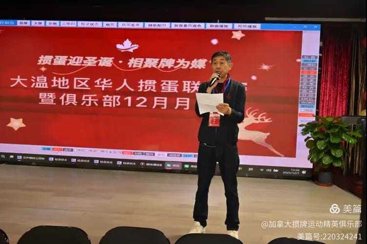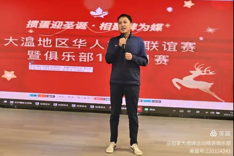 【高度传媒转载主办方供稿】2025 年 12 月 7 日下午,由 加拿大掼牌运动精英俱乐部 主办,恒昇金融集团、加拿大青年商会、北美国际建筑业总商会 协办的“掼蛋迎圣诞 · 冬日联谊赛”暨俱乐部为香港火灾赈灾募捐活动启动仪式 在温哥华地区列治文市顺利举行。现场 150 余位来宾、100 余位选手 齐聚一堂,高手云集。在冬日暖阳下,大家 以牌会友 · 以赛增情,共度温馨洋溢的节日午后。
