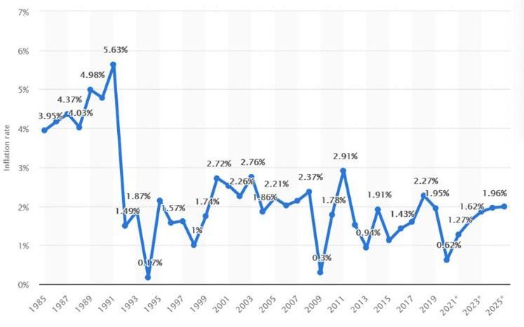 房贷利率低至1.0%左右,这是什么概念?老张来告诉您,相当于银行给各位发放无息贷款,其原因在于,1.0%左右的房贷利率,低于传统上的通货膨胀率。如果通货膨胀率高于房贷利率的话,贷款买房就是在天天赚钱。而事实上,加拿大的通货膨胀率一直维持在1.6%这个平均值以上。请看下面的通胀率走势图表: