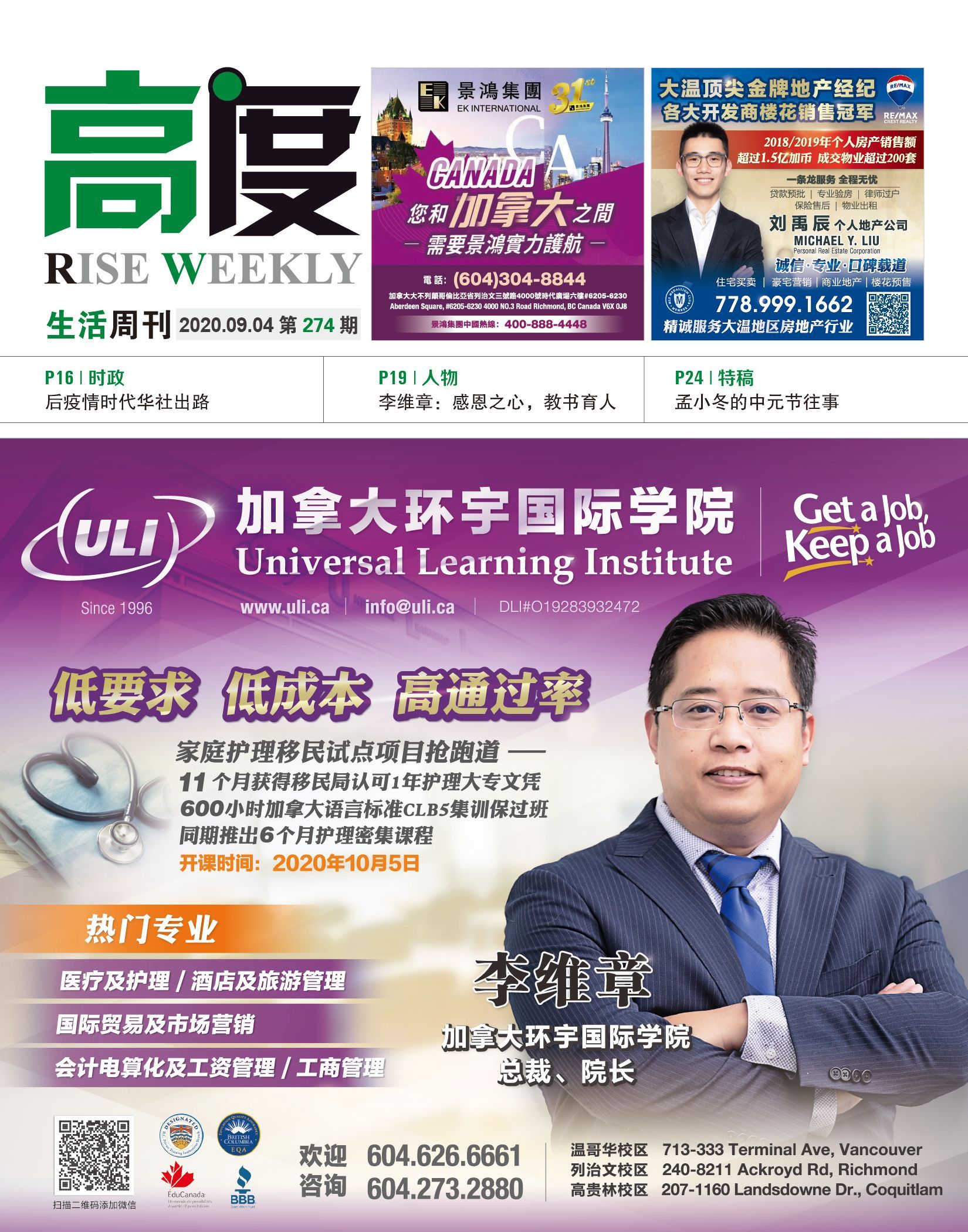 透过他鼻梁上的眼镜,一眼看去,陕西蓝田人的憨厚、淳朴与热情,在他的眼神里一览无遗。人生跨过49载,但其中30载——西安10年、北京10年、温哥华10年,是他开启人生“三步走”、奠定成功基础的成长之年、关键之年。30年来,历经风雨,最终九转功成,从IT行业到出版界,再从出版界到教育界……一个个转身,让光阴变成了故事,见证了他的昨天和今天。他,就是闻名温哥华的华裔教育家——加拿大环宇国际学院(ULI, Universal Learning Institute)总裁、院长李维章。获三级政府认证,学院资质齐全
