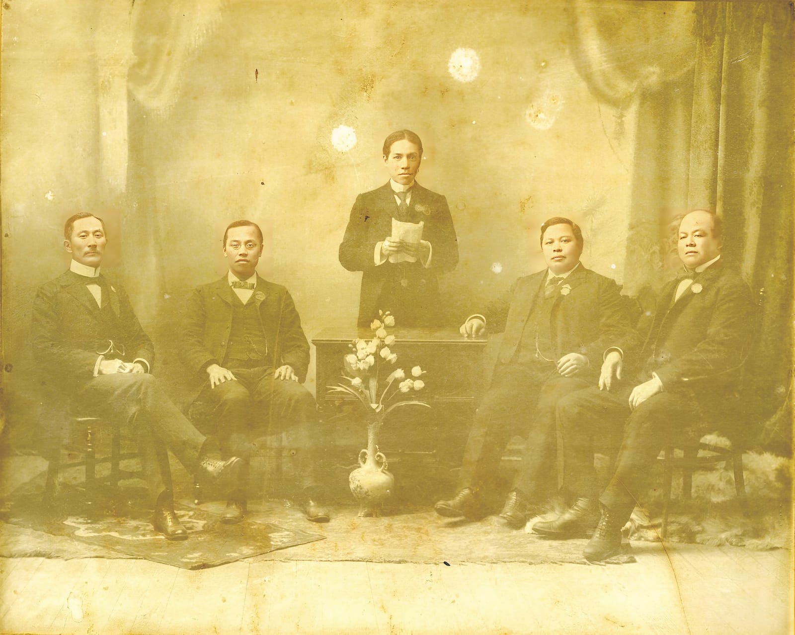 温金有(左一)、叶生(右一)等人合影。中站者发型服饰与梁启超在温哥华影楼的照片十分相近,怀疑是梁启超。(温哥华市档案处藏)