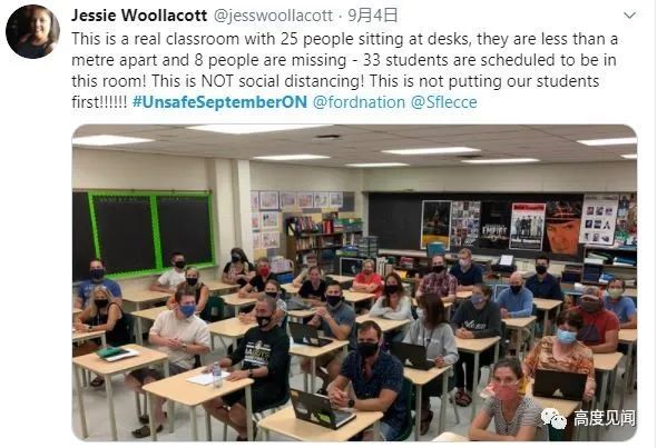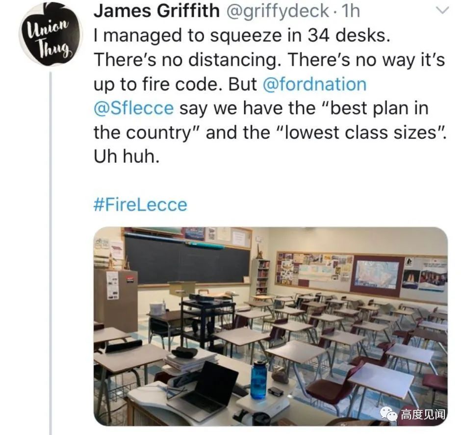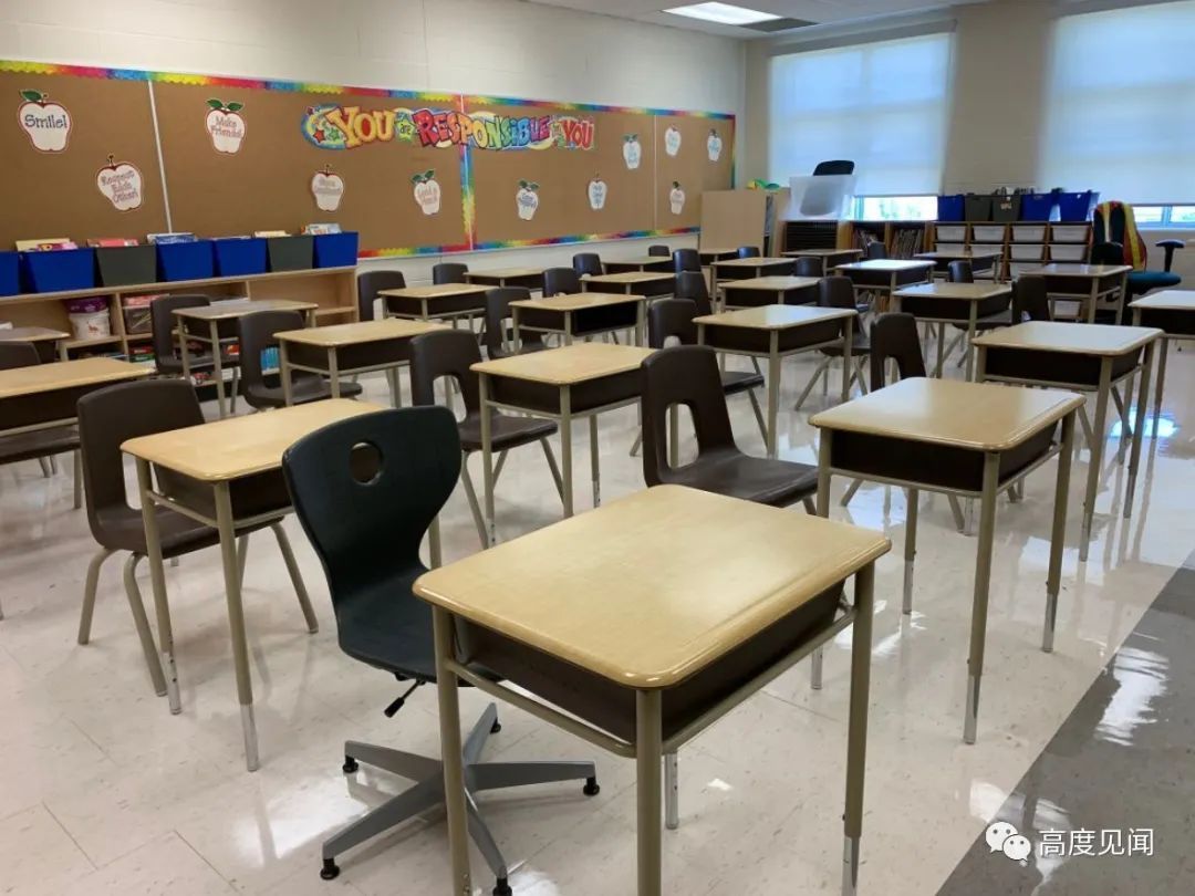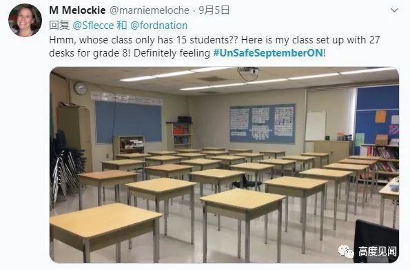 安省的一位老师说:“刚刚在教室里摆下了25张桌子,无论省长和教育厅长说什么,这个教室显然无法保证社交疏离。”