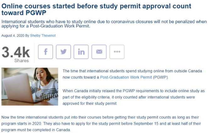 因此,加拿大移民部出台了新政策,允许将线上的学习时间一并算入申请毕业工签的学习时间中,只不过要求国际留学生在获得学签后才能开始计算。同时,新规显示,2020年入学的留学生,在获得学签之前的线上学习时间也一并算作入学时间,也被计算在申请毕业工签的授课时长中,并不会对工签的申请有所影响。这类留学生必须在9月15日之前提交学签申请,并且至少有一半的课程是在加拿大完成的。