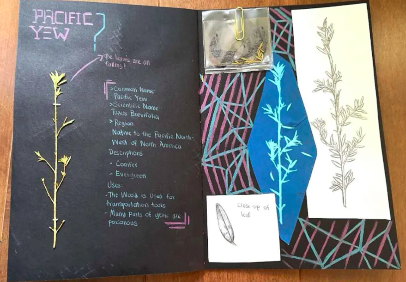 艺术夏令营活动,每星期有一天可以和同学、老师们见面上课(当然是在保持一定社交距离的情况下),还有一天是线上课程,剩下的时间用来完成个人创作,就是我们的作业。什么?作业?作业一听起来就很枯燥,恰恰相反的是夏令营留的作业不但没有令人头疼,而且是兴致很高地一步步把它完成。每次的创作主题都截然不同,创作思路没有局限,老师也一只鼓励我们去挑战以前没有尝试过的美术技巧。比如说,在第一个星期我画了很多速写与科学绘图,到了第二个星期我完成了一个用蓝晒法与植物素描创作的植物标本书(艺术馆提供创作所需的材料)。线上课,几位老师给我们介绍很多世界各国的现代艺术家,从建筑设计师到街头艺术家,看到不同的艺术表达方式让我开阔了眼界,同样也给予了我很多未来创作的灵感和启发。最后我们还做了一个全景相片雕塑作品,而且会在Richmond的一个公园进行展览,让我很期待。