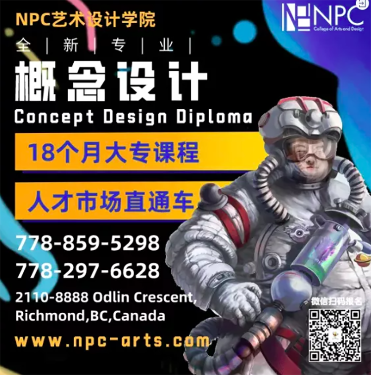 NPC艺术设计学院全新概念设计大专文凭证书课程(Concept Design Diploma Program),由BC省高教厅PTIB认可的课程及文凭,18个月full-time学习,包括5星期本地游戏动画公司实习,让毕业生信心满满地迈向职场。