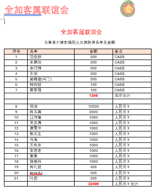此次募捐,朱展伦会长,范佐研会长,江传瑜执行会长,肖礼斌秘书长等等先行带头。各位乡亲慷慨解囊,纷纷捐献。短短两天。共募集善款人民币 22400元,加币1200元。大爱无疆,功德无量。