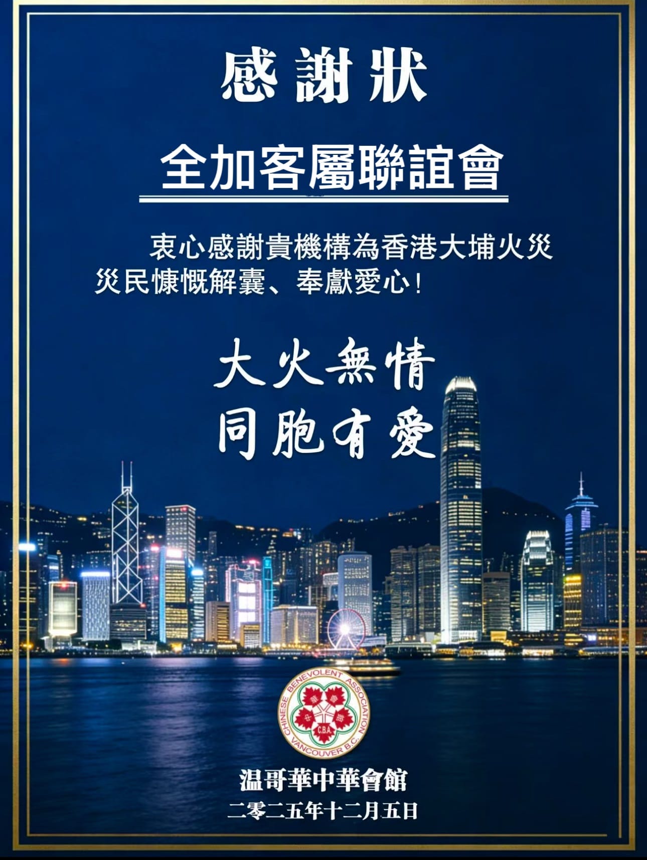 为此:我全加客属联谊会向各会員和乡親发出倡议: 香港大埔宏福苑罹患大火灾,举世哀伤,为灾民感到无比悲痛,让我们伸出救援之手,参入赈灾,募捐活动。