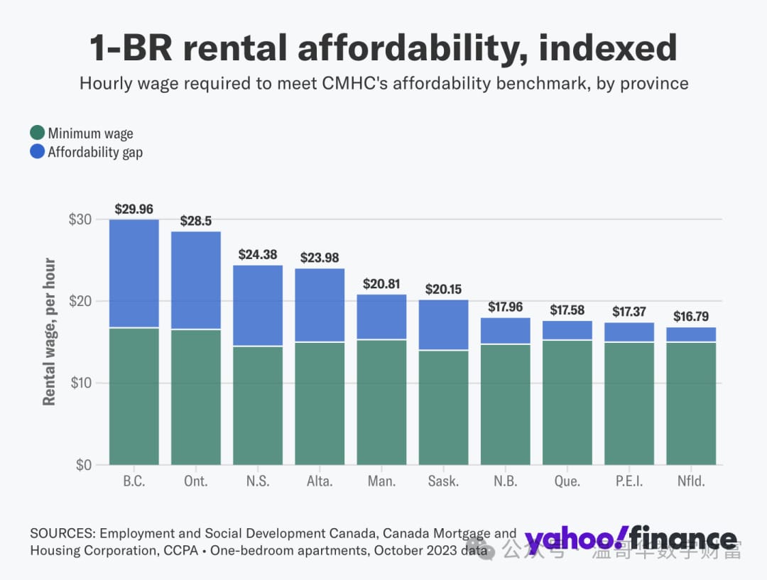 CCPA的报告基于加拿大抵押贷款和住房公司(CMHC)的社区平均租金数据,采用“租金工资”概念,即根据CMHC的住房负担能力标准来衡量支付普通住房所需的每小时工资。这一标准认为,当住房成本低于税前家庭收入的30%时,住房即为可负担的。