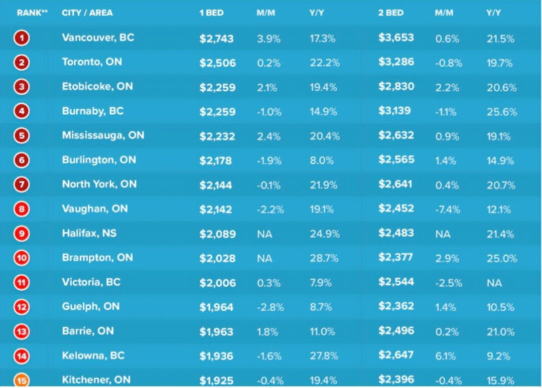 在BC省,4 月份的平均挂牌租金为 $2,541,安大略省仅次于BC省,为 $2,401。对于温哥华的一居室,3 月份一居室的平均租金达到 2,743 加元。对于两居室,温哥华租房者的平均租金为 3,653 加元。温哥华在这两种房产类型的租金上都领先全国。紧随其后的是本拿比,该城市在全国第三贵,一间卧室的平均租金为每月 2,259 加元,与安大略省的怡陶碧谷并列。维多利亚和基洛纳是加拿大最昂贵的 15 个城市之一。