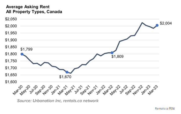 (图片来源:DH News)Rentals.ca表示,在冬季经历了一段时间的“缓和”之后,租金现在正在重新加速。这也是自去年 11 月以来租金首次环比上涨,目前需求严重超过供应。自 2020 年 3 月以来,所有物业类型的平均要价稳步上升。