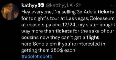 还有的人因为买不到机票,急着转让3张Adele的拉斯维加斯演唱会门票: