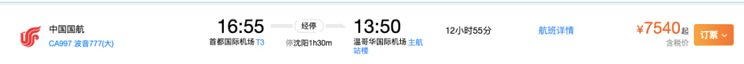 搭乘国航航空2月1日从北京飞温哥华,票价¥7540元起。