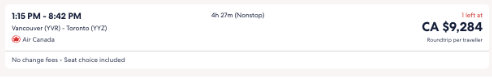 搭乘加航往返多伦多和温哥华,要价9284加元。回程日期是12月30日。
