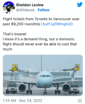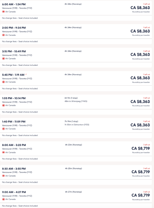 而对于从温哥华飞往多伦多的乘客,只要不是在本周和下周初出发,还是能找到在1000加元以下的机票。