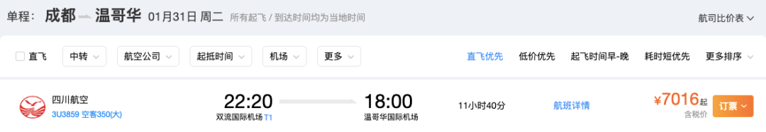 搭乘四川航空1月31日从成都直飞温哥华,票价¥7016元起。