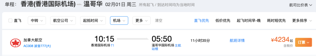 搭乘加拿大航空2月1日从香港直飞温哥华,票价¥4234元起。