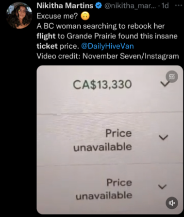 一位BC省妇女在找飞往阿尔伯塔省城市的航班时,也发现单程机票的价格惊人。