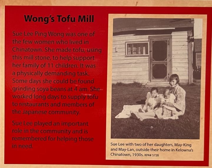 其中一则先辈故事在博物馆内被展示,老房子旁有个石磨,它的主人正是上文提到的唐人街少数女性之一Sue Lee Ping Wong,她用这个石磨制作豆腐来养活全家 11 个孩子。这是一项对体力要求很高的工作,有时Sue Lee会在凌晨 4 点起床磨豆子,一天要忙碌很长时间,为餐馆和日本裔社区成员提供豆腐。养家的同时,Sue Lee 也为社区做出贡献,因帮助弱势群体被人们铭记。