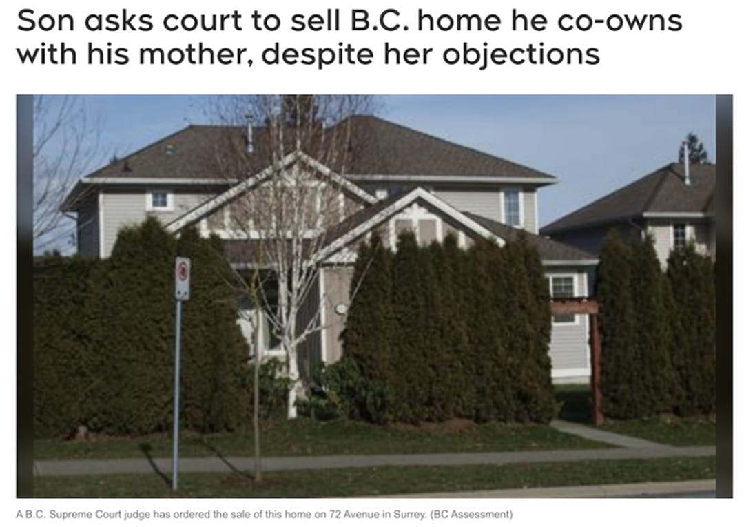 据CTV News报道,BC省的一名法官下令出售大温素里市的一处住宅。该住宅为母子共有房产。母亲反对出售,并且一直住在这栋房子中。