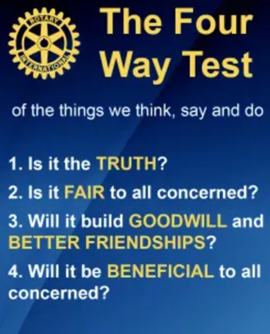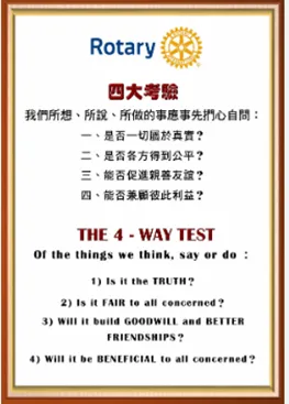 让我们挥动爱的翅膀,时刻经历扶轮四大考验:所想、所说或所做的事情,是否一切属于真实?是否各方得到公平?能否促进亲善友谊?能否兼顾彼此利益?