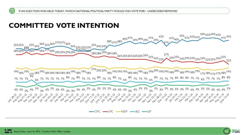 特鲁多在意大利举行的G7峰会上甚是高调,俨然自由世界的领导人,但在国内却遭遇最差民调,支持率跌至执政以来的谷底。最新Abacus Data民调显示,他领导的联邦自由党仅得分22%,而官方反对党保守党则大幅领先近一倍,约为42%。