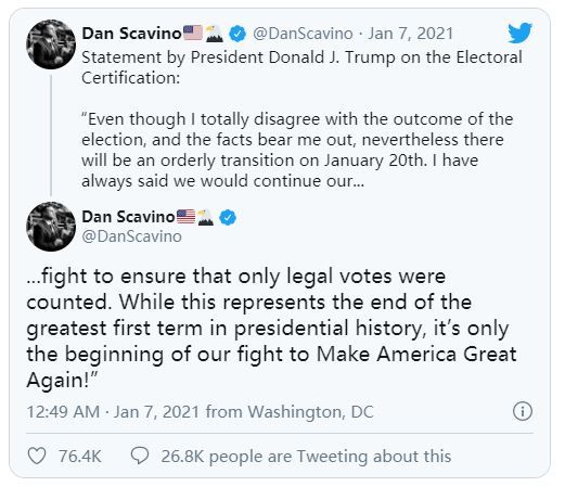 在华盛顿特区发生骚乱之后,特朗普这次罕见的“怂了”,由于他的个人推特账户和脸书账户都被封了,他只能通过自己的社交媒体总监Dan Scavino来发声,承诺向拜登“有序”移交权力。
