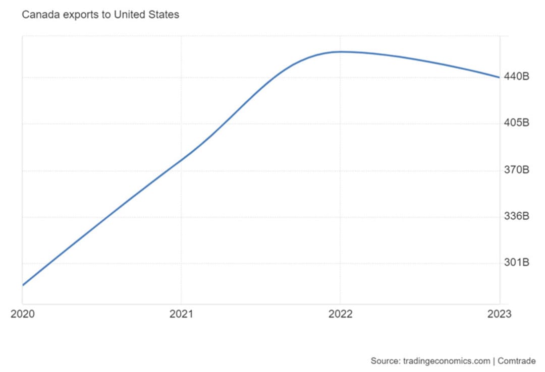 根据数据显示,加拿大对美国的出口额在2023年达到了4,396亿美元,显示了两国之间紧密的经济联系。尤其是,加拿大77%以上的出口依赖于美国市场,这使得美国成为加拿大最重要的贸易伙伴。关键商品包括石油、汽车和农产品,其中加拿大是美国最大的原油供应国,约占其进口量的55%。