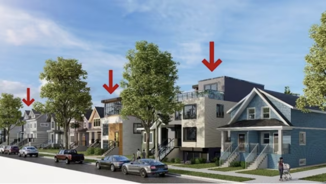 温哥华市的渲染图,展示了传统单户住宅社区中的复合住宅的样子。(CBC)