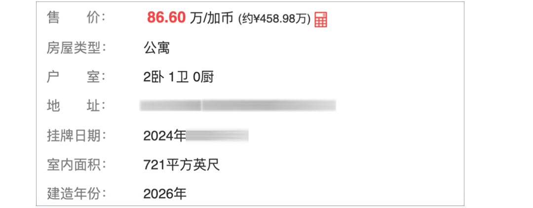 这个房源的建造年份是2026年,说明卖家转让的是楼花。地点位于列治文,户型是2卧室。而这个项目2卧室的起价好巧不巧就是86.6万。