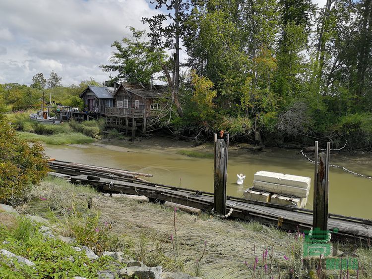借助谷歌地图,我们可以发现小渔村位于加拿大卑诗省列治文市4号路的最南端,与弗雷泽河交接处。顺着弗雷泽河,有一条小水沟,潮涨时成河,潮落时是湿地沼泽。