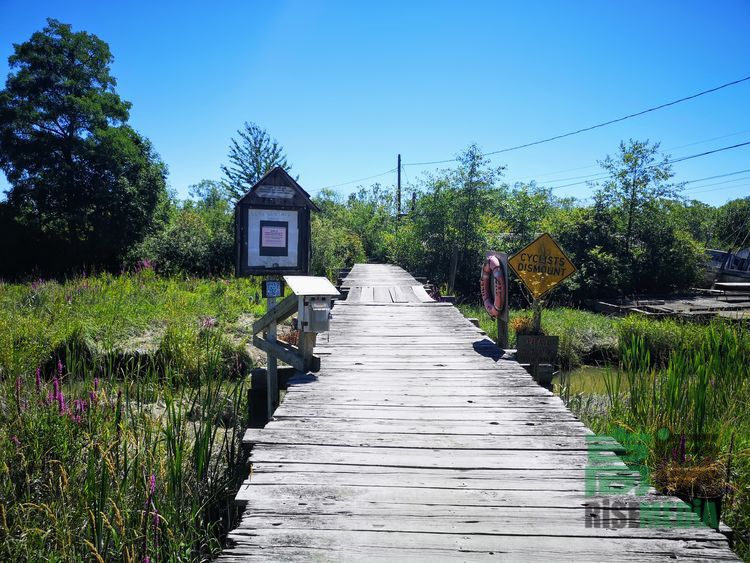 水沟上唯一一座约40米长、2米多宽的没有扶手护栏的简易小木桥连接了两岸。北岸是列治文市的河堤大道,南岸则是一个长约1公里、宽不过百米的长满小树林和灌木丛的惠特沃斯岛(Whitworth Island),也称为吉尔穆尔岛(Gilmour Island)。又因小岛的形状象一个长型的西餐盘,它又有一个别名,叫做餐盘岛(Dinner Plate Island)。