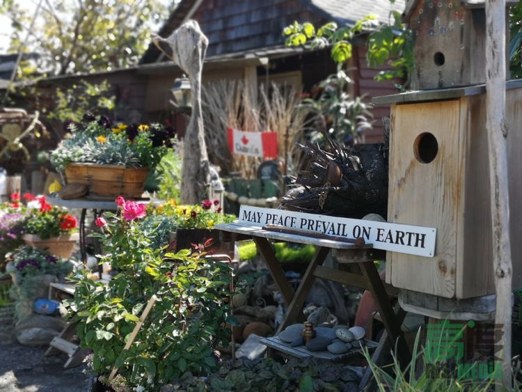 就在日本二战投降75周年纪念日这个时节,这位女屋主又在小木屋的门口花丛中展示了用英文和法文分别印制的“愿世界和平”的横匾。