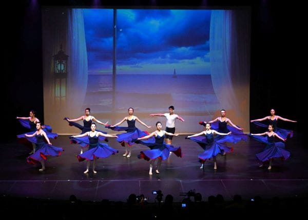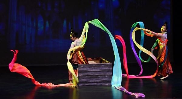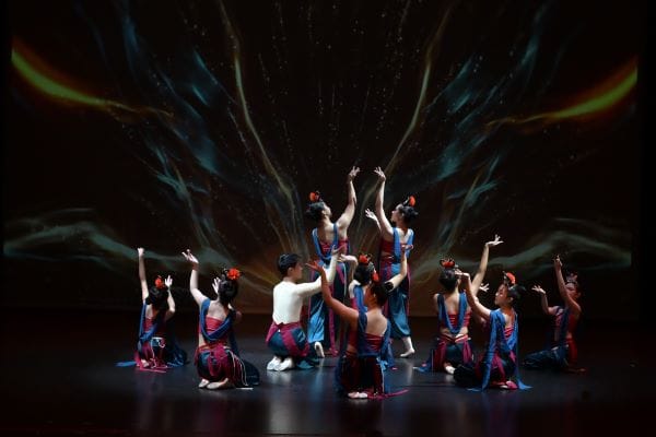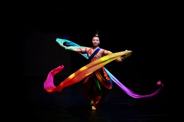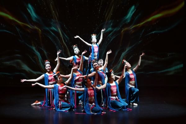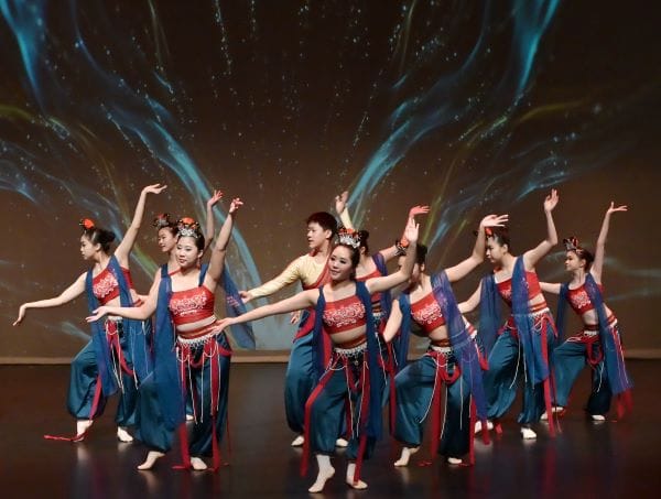 第七场《敦煌舞》有十位演员(Mandy Wan,Emily Zhang, Sherry Wang, Summer Shen, Lydia You, Brennya Kung, Allen Liu, Katrina Hui, Kacey Wu, Cici Zhao)一起演绎今晚的大作。也是洪杰老师的优秀代表作品。“敦煌舞”来自“敦煌艺术”中的壁画舞姿,属于中国古典舞范畴。以莫高窟为主体的敦煌石窟艺术,由建筑、壁画、彩塑三者互相结合而成,涉及面广阔。“敦煌艺术”中所含乐舞更是一个亮点,舞姿独特别致,高雅恬静,千姿百态,异彩纷呈。