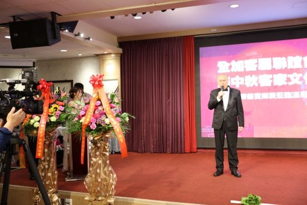 中华人民共和国驻温哥华总领事馆代总领事曾智在领事李悦然的陪同下,百忙之中,也抽出时间,亲临现场,与客家人同欢共庆中国传统佳节,他在致辞中肯定客家社群对促进中加民间交流与多元文化融合的重要贡献。他说,全加客属联谊会举办这样一次中国传统文化晚会,对于我们在海外的华侨华人具有特殊意义。他说:从中秋里面延伸出来的家庭和睦,社会和谐的理念,与加拿大多元文化的理念是非常契合的。他热烈祝贺全加客属联谊会客家文化之夜圆满成功,祝福大家中秋快乐!