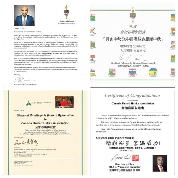 加拿大国会议员白恩斯(Parm Bains)先生, 加拿大国会议员区泽光先生,BC省议员屈杰冰女士,BC省议员周炯华先生因议会开会,不能前来。但是他们发来了贺信贺函,并派代表参加晚会,表达他们对全加客属联谊会客家文化中秋晚会的祝贺和对客家人的祝福。