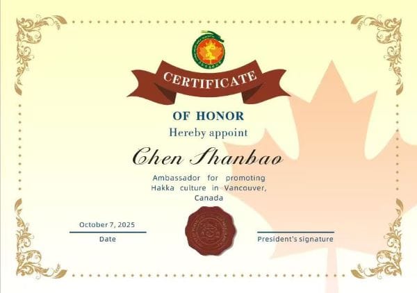 全加客属联谊会还特别感谢梅州乡贤陈善宝先生,千里迢迢赶来温哥华,给温哥华客家乡亲带来了浓浓的家乡情,家乡味,家乡话...推动,宣传,弘扬了客家文化,是我们客家文化的推广大使。全加客属联谊会永远荣誉会长朱展伦先生为此,特地向陈善宝先生颁发了文化大使聘书